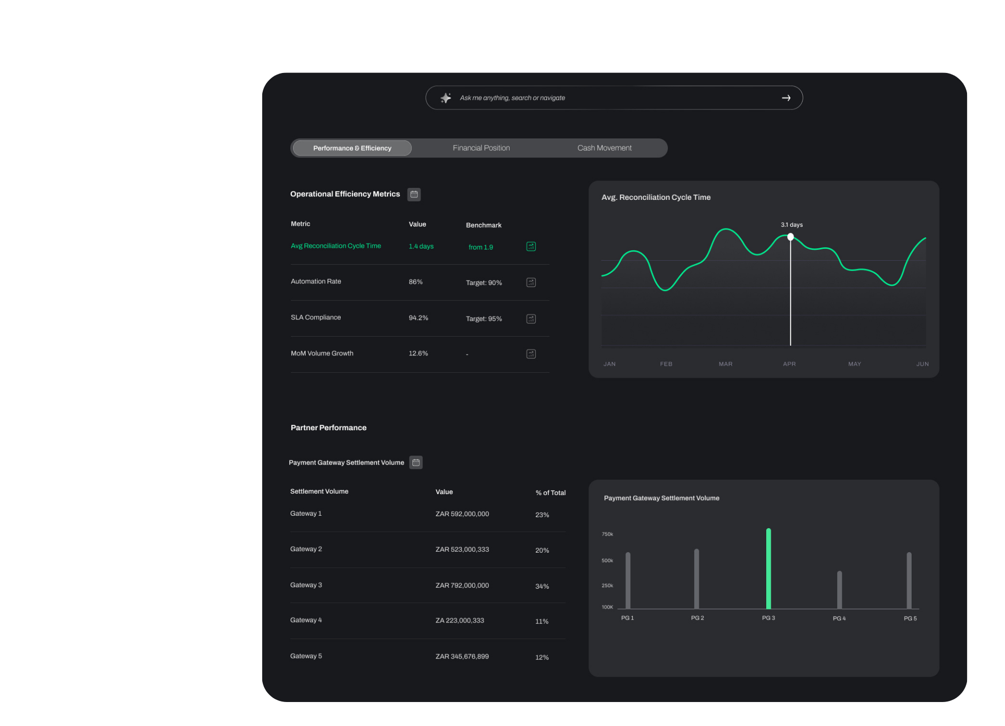 Real-time updates, not end-of-day reports. Leadership answers "What's our settlement position?" in seconds.